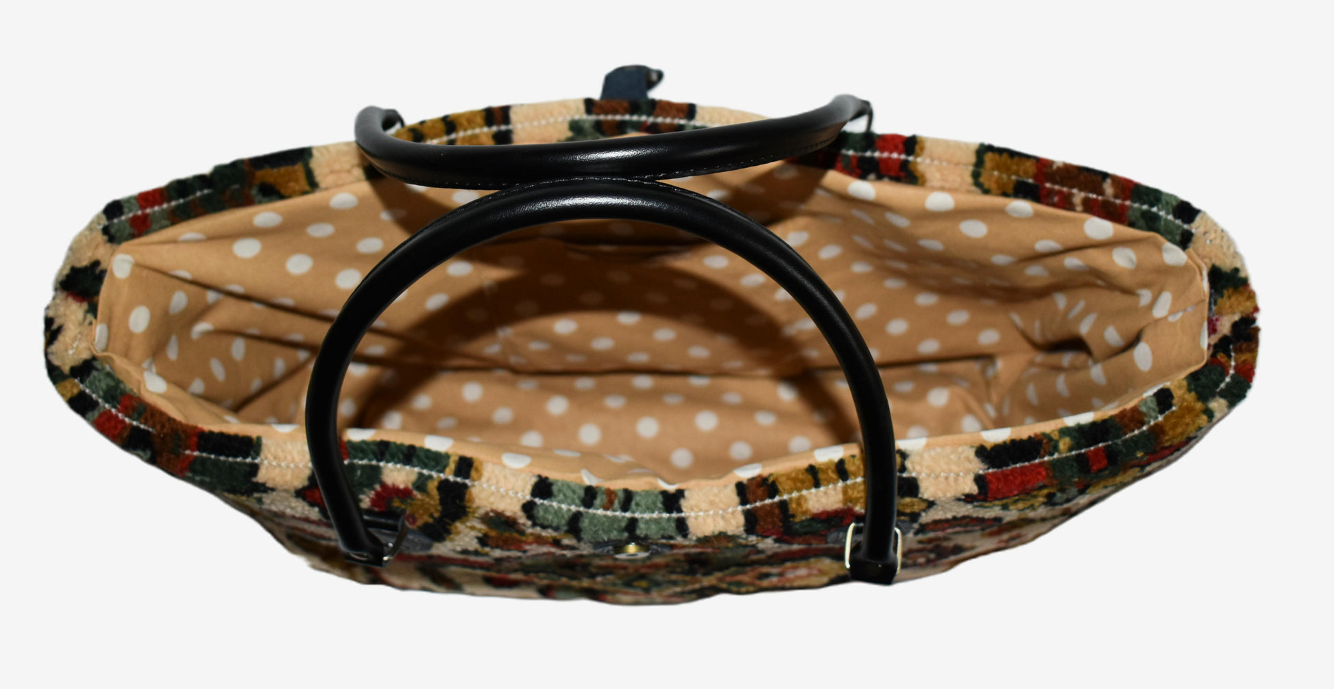 A grander expression of the Beverley aesthetic, this overnight bag blends vintage opulence with practical flair. Crafted from plush carpet in a baroque floral motif—rich in burgundy, forest green, and antique beige—it’s finished with sleek black leather handles and brass hardware for a look that’s both stately and spirited.