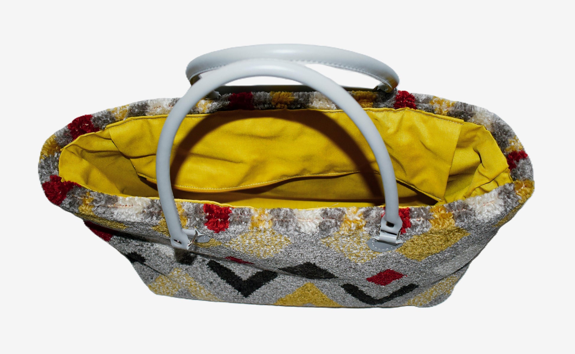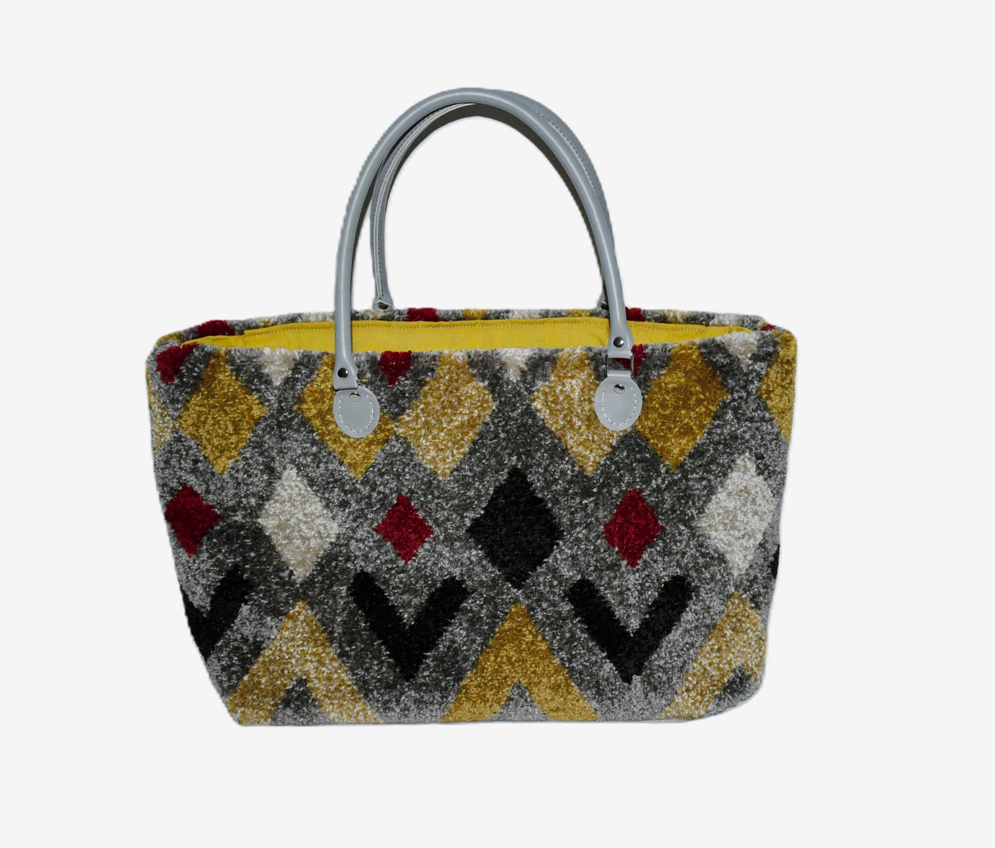 Bold, plush, and ready to roll—the Harley Zip & Go Overnight Bag is your geometric getaway companion. Crafted from genuine wool carpet in a riot of chevrons and diamonds—mustard, crimson, charcoal, and cream—it’s a bag that doesn’t whisper style, it shouts it (politely).
